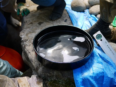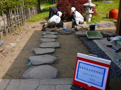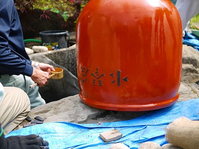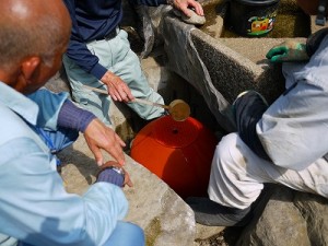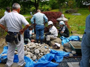 公園ニュース 日本庭園内水琴窟の再生 2011年7月7日 nakajima-park 去る7月3日に日本庭園内の四阿脇にある水琴窟の改修作業が行われました。 作業をしてくださったのは、札幌造園技能士会の皆さんです。 水琴窟の音が聞こえづらいのでその再生と、札幌の造園技術者の方々の技術向上・技術継承を目的として、札幌造園技能士会の皆さんにご協力いただき行われたものです。 水琴窟の構造に関しては、こちらを見ていただけると分かりやすいと思います。 こんな時にしか、中の構造を見る機会なんてありません。 中にはこんな甕が入っているんだ(p_-) この水盤に水が滴り落ちて、その音が甕の中で響いて、地上に響いてくるんだ♪ へぇ~(@_@) と、感心しながら私は観ていたのです。が・・・ その再生作業の中で、この甕と水盤の組合せが、今ひとつ良くなく、音が鳴りづらいのでは?と言うことになり、違う形状のもので試してみてはと言うことで、現地の有りもので実験を繰り返しました。 しかし、時間切れと、水盤の替わりとなり得る器不足から、今回の再生作業は完了しませんでした。 今現在、技能士会の皆さんが甕と水盤との組合せがどれがベストなのか調査中です。 しばらくの間、水琴窟の音をお聞きいただくことはできません。次回の作業の際に甕と水盤とのベストコンビを埋め込み、水琴窟の音を楽しんでいただけるようお願いしています。 その時に、こちらのホームページ等でご案内しますので、ご興味のある方は、是非、現地にて再生するまでの過程をご観覧いただければと思います。