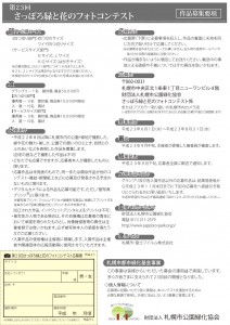公園ニュース さっぽろ緑と花のフォトコンテストの作品募集中 2011年8月1日 nakajima-park 第23回さっぽろ緑と花のフォトコンテストの作品を募集中です。 グランプリ作品には賞状楯と賞金50000円となっています。 たくさんの作品の応募をおまちしてます。 詳しくはチラシをご覧ください。