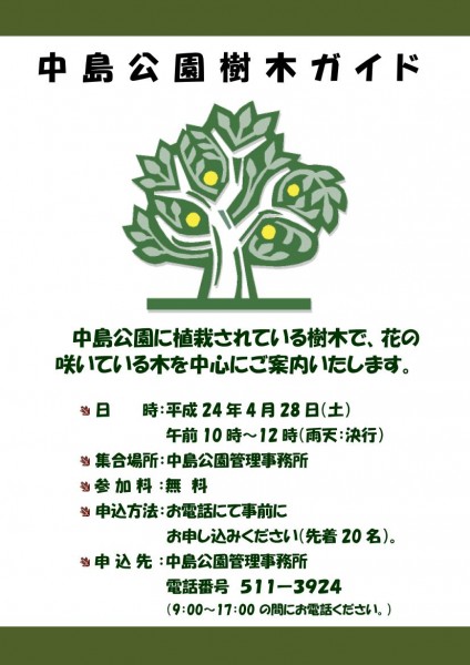 公園ニュース 中島公園樹木ガイド参加者募集中 2012年4月13日 nakajima 中島公園の樹木に興味のある方に朗報です。 4月28日(土)、樹木のご案内をいたします。春の芽ぶきの様子や、花を付け始めた樹木などを中心にご案内します。 樹木のことを知れば、もっと公園散策が楽しくなりますよ。
