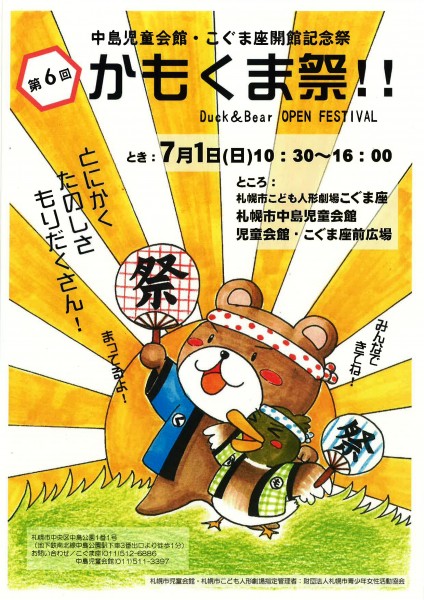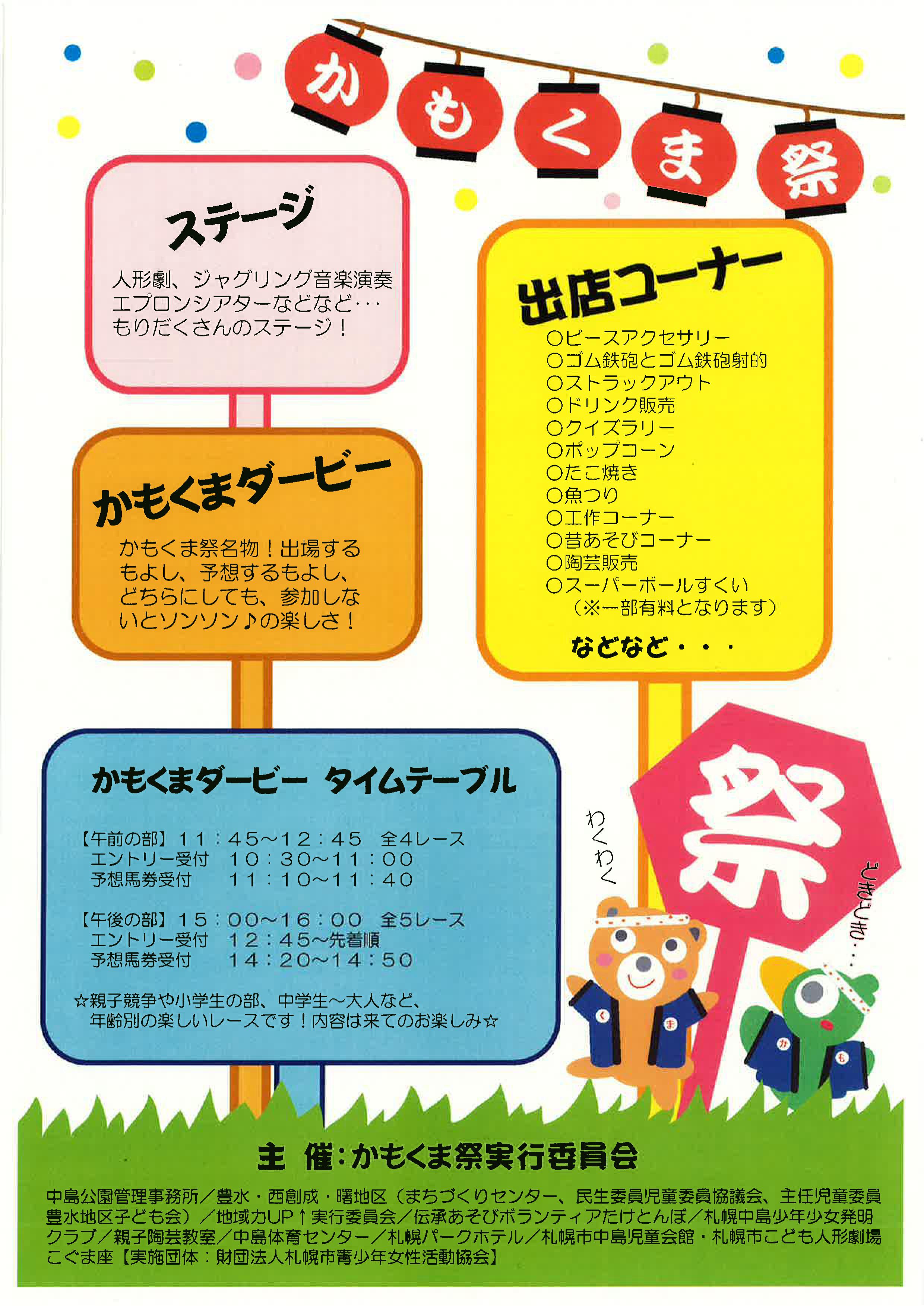 公園ニュース かもくま祭開催せまる 2012年6月30日 nakajima 今週末の7月1日(日)に「かもくま祭」を開催いたします。 こちらは、中島児童会館・こども人形劇場こぐま座の前の広場を会場として、地域の皆さんでアイデアを持ち寄り、オリジナリティー溢れるプログラムを開催しながら、皆さんに楽しんでいただけるイベントを行おうというものです。 アイデアあふれる楽しいプログラムが盛りだくさんです。ぜひ多くの皆さんにお越しいただければと思います。