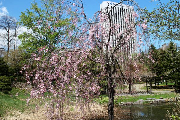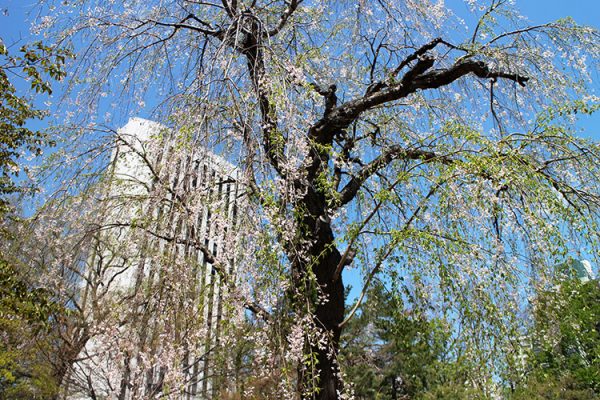 日本庭園のシダレザクラは見頃を過ぎましたが、花は咲いています。