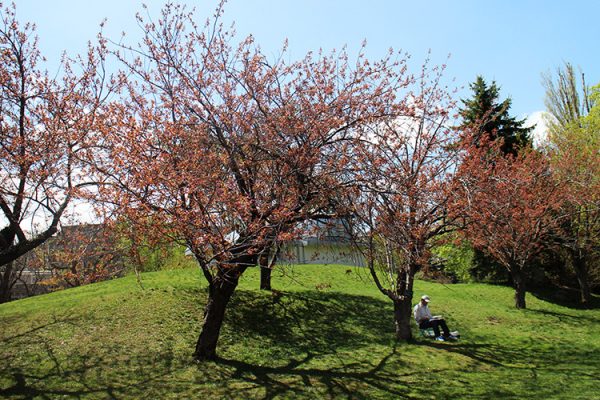 ※パークホテル前のヤエザクラは日当りの良い部分から開花していました!