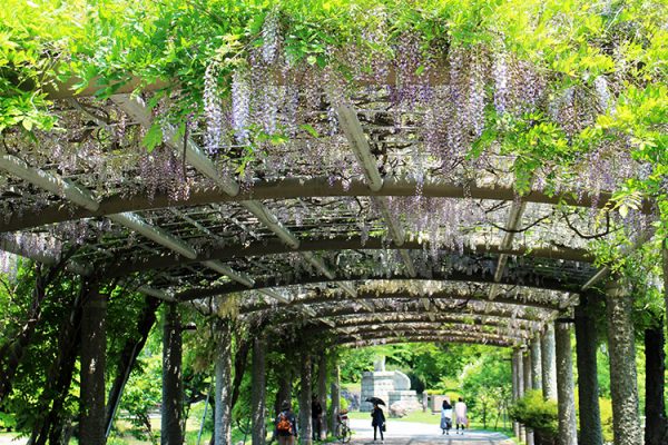 日本庭園近くのフジ棚は、まだ少しお花が付いていますが、風でハラハラと散っています。