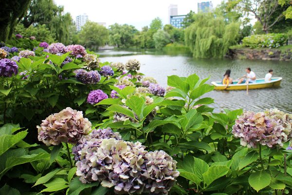 中島公園にある菖蒲池の周りには、たくさんのアジサイが植栽されています。