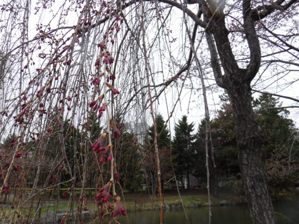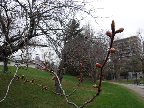 開花いたしました。全体としては1~2分咲きですが、日当たりの良い場所では開花の進んでいる樹木もあります。