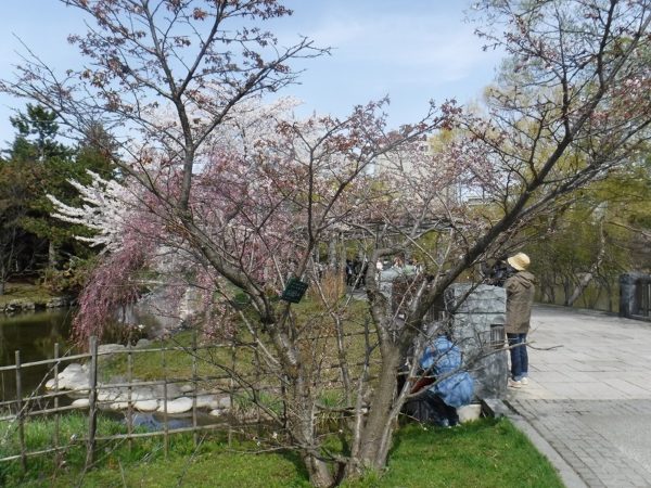 チシマザクラの奥に咲いている、今見頃のシダレザクラへ目が行ってしまいます。