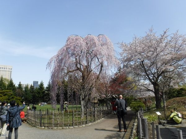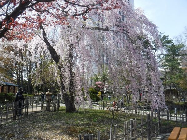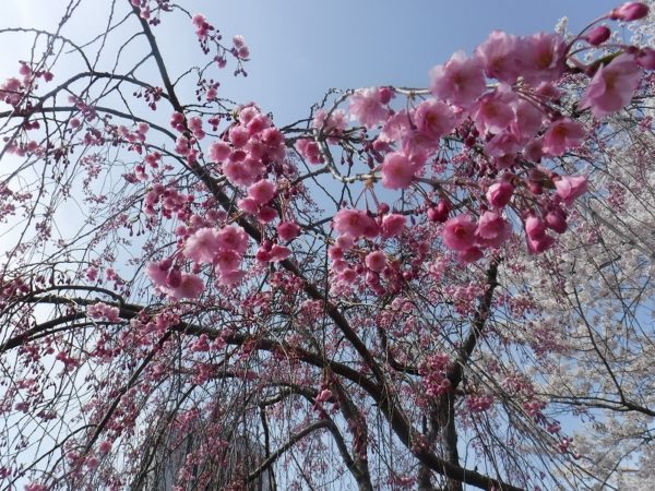 日本庭園中央にあるシダレザクラに目がいってしまいますが、 こちらのシダレザクラは色濃く艶やかな花びらがいっそう可愛いです。
