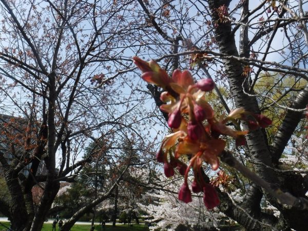 本日、満開最終日といったところでしょうか。そろそろ葉っぱが出てきそうな気配です・・・。