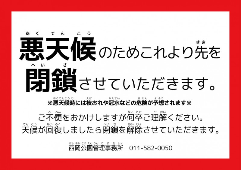明日以降、天候が回復次第制限は解除させていただきます。
