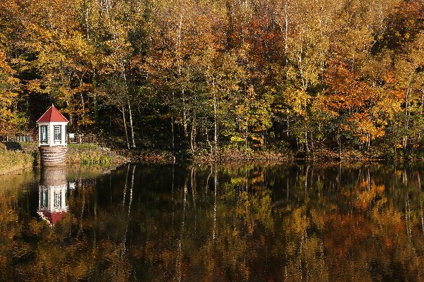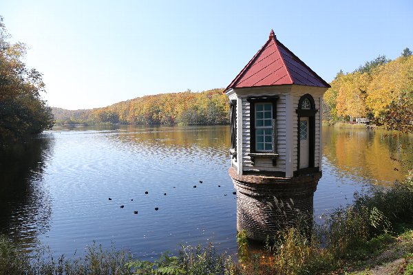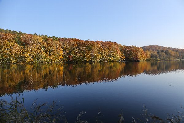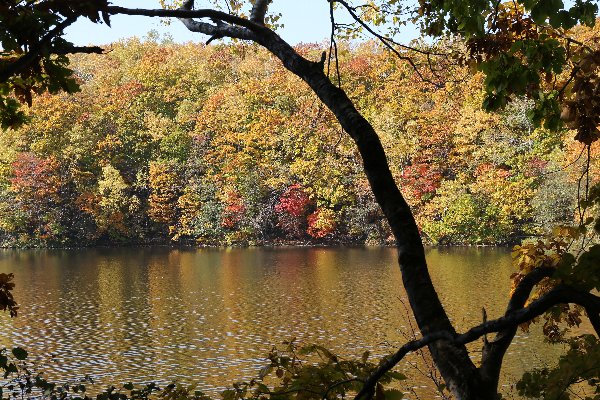 池の東側=右岸側の道、木が切れた場所から対岸を見るときれいです。