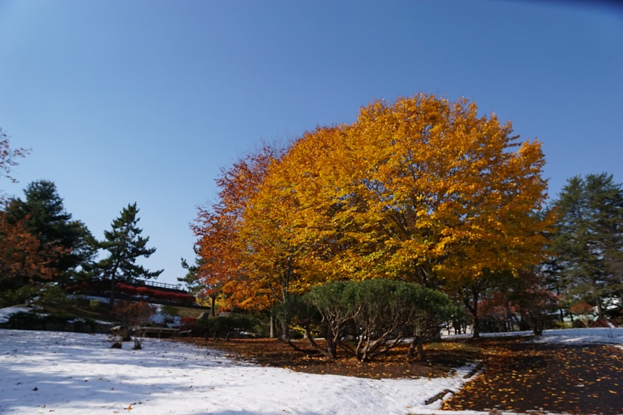 ブナの黄金色と真っ青な空!そして前の晩にうっすらと積もった雪の色合いがきれいですね。