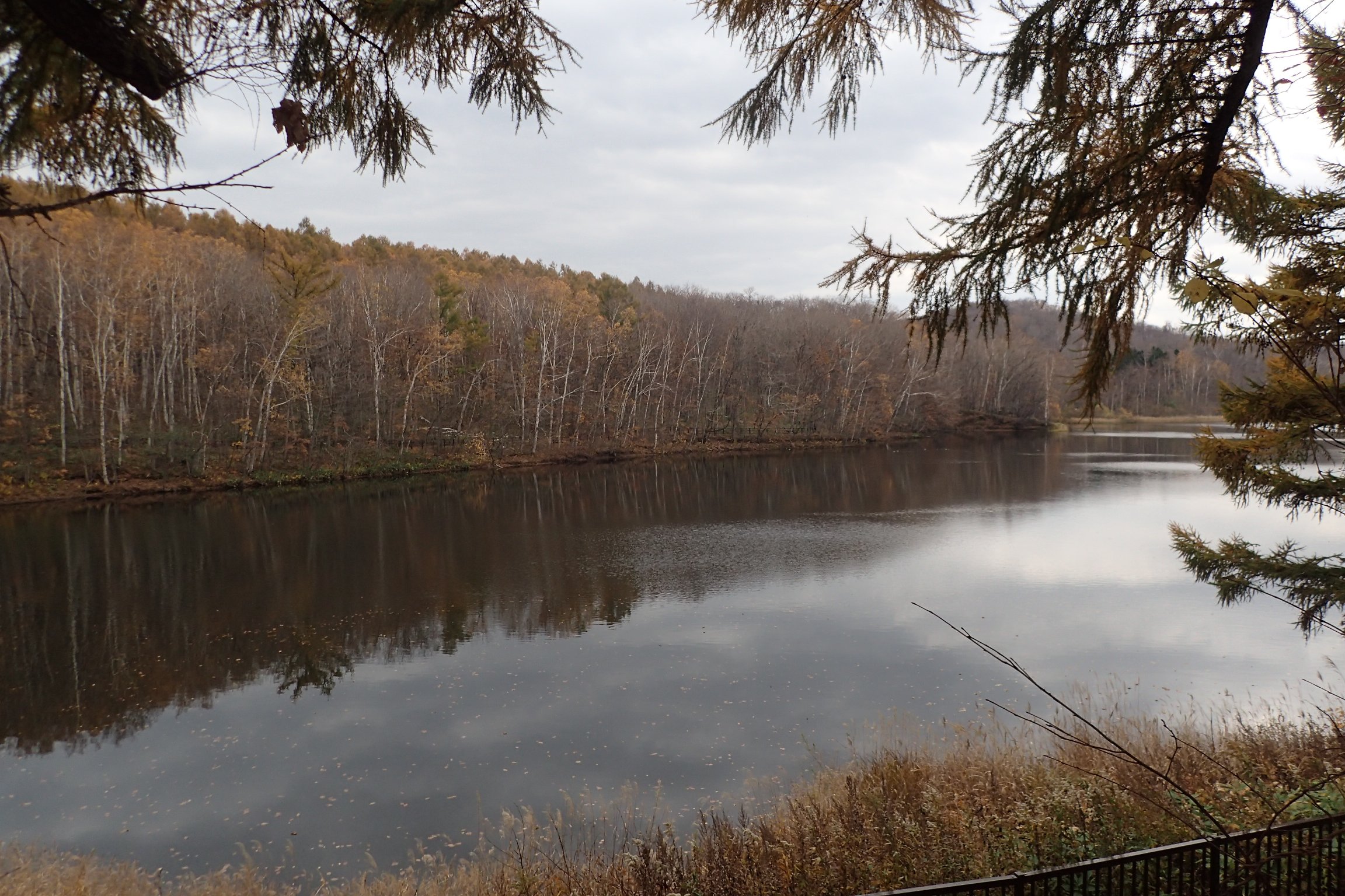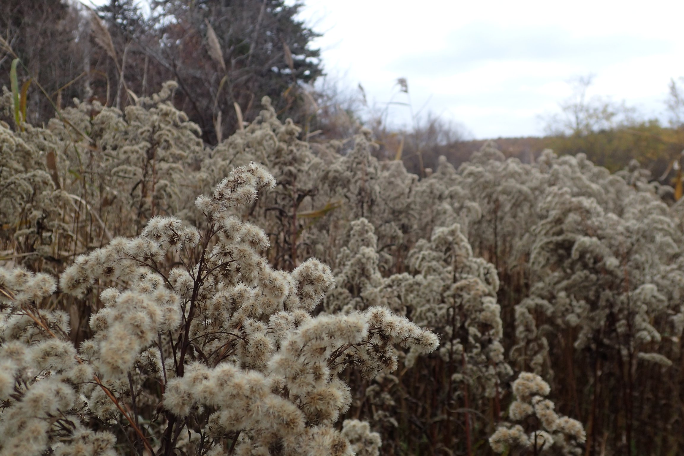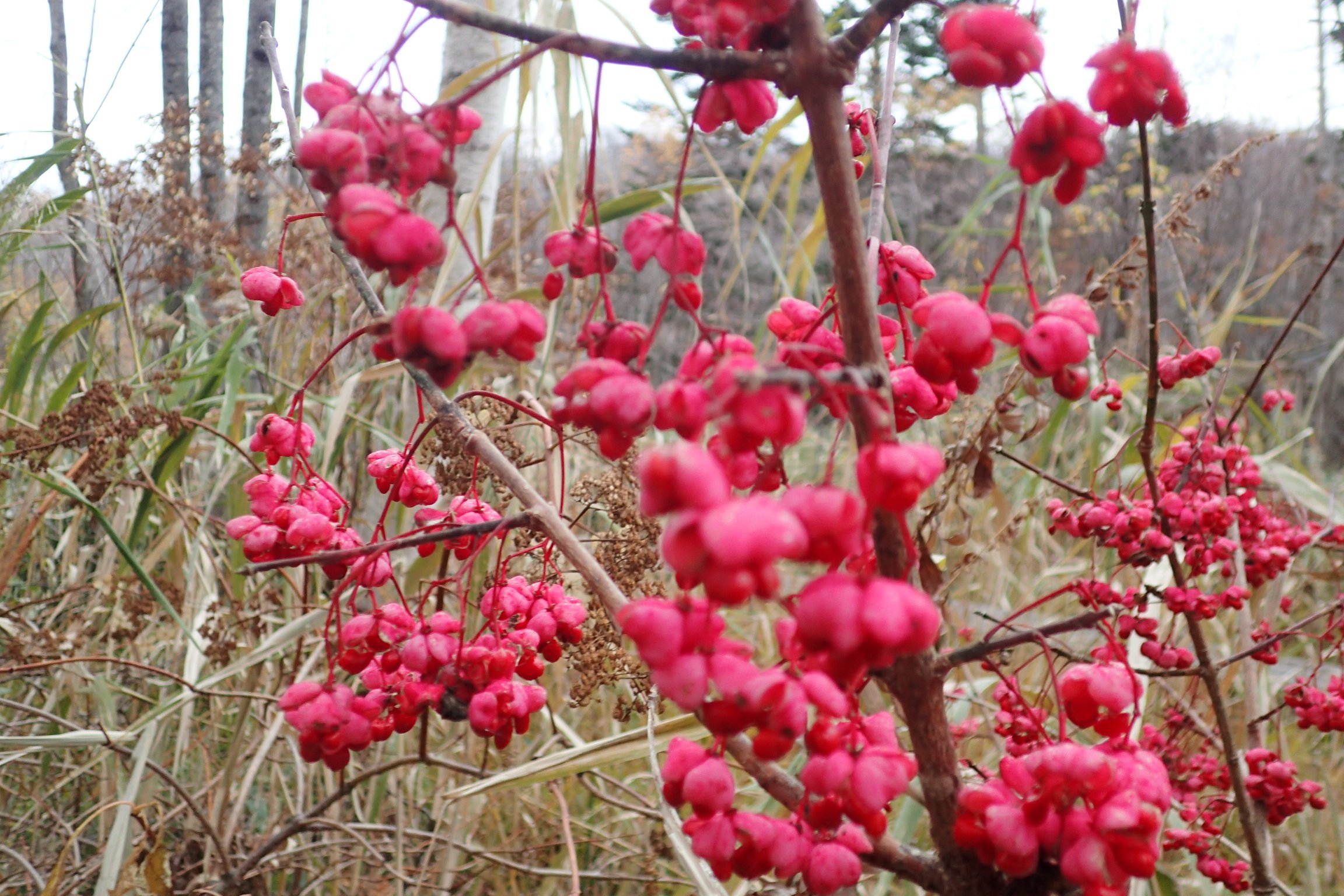 木道沿いではマユミの実が開いて種子をぶら下げています。