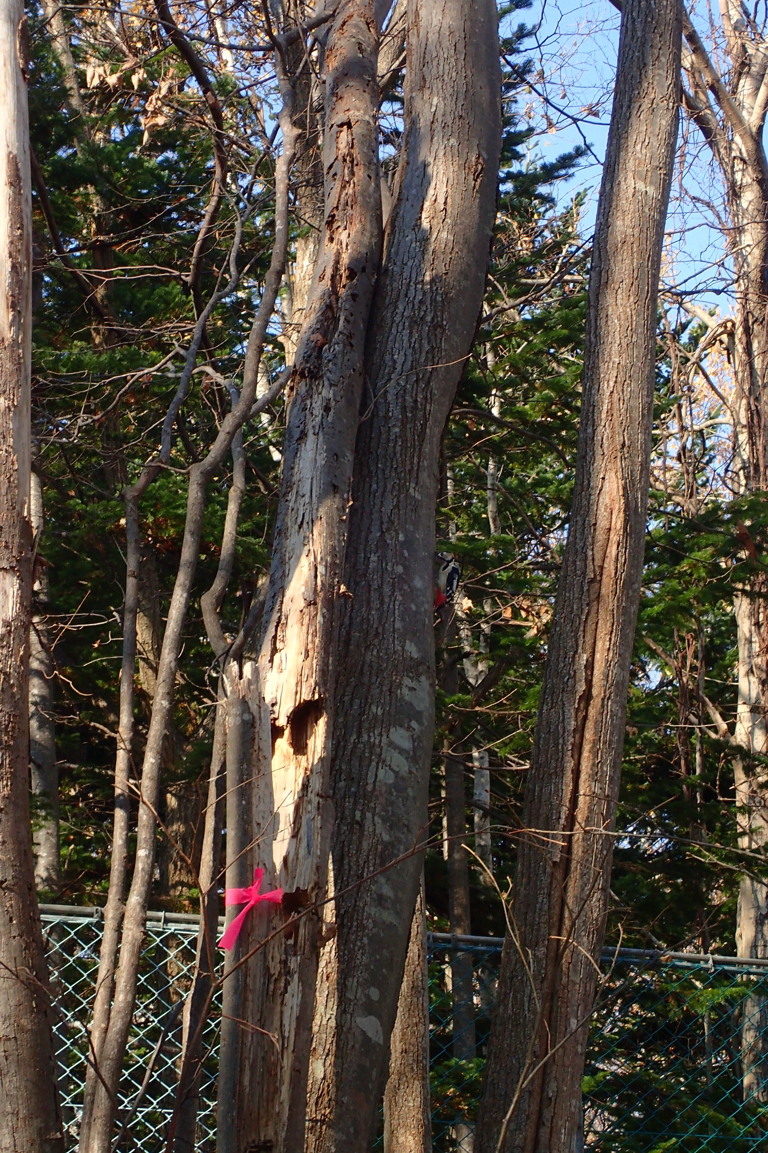 アカゲラが一生懸命、木をつついていました。