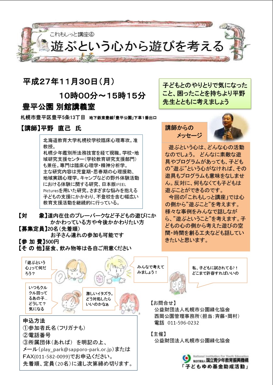 | 申込み方法 | ①参加者氏名(フリガナも) ②電話番号③所属団体(あれば)を明記の上、メール(play_park★sapporo-park.or.jp ★を@に変えて送信ください) かFAX(011-582-0099)で西岡公園にお申込ください。先着順、定員(20名)に達し次第締め切ります。 お子さん連れの参加も可能です。 |