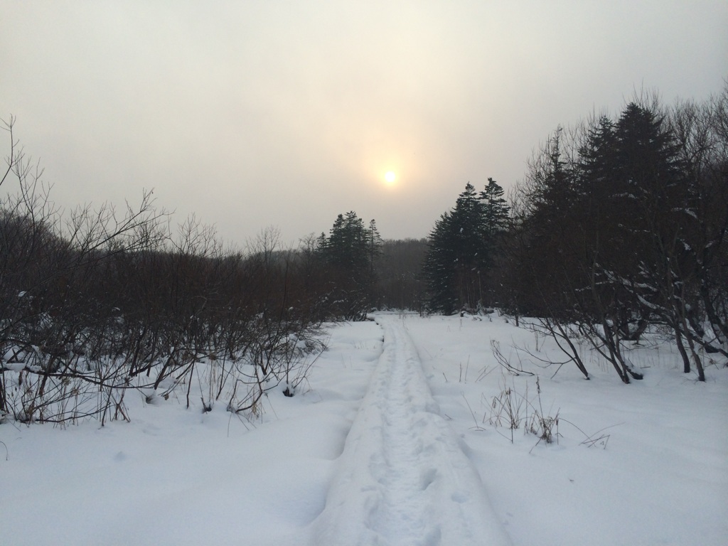 東側の木道は、幅が狭い木道の上に雪が積もり、踏み外しやすくなっています。