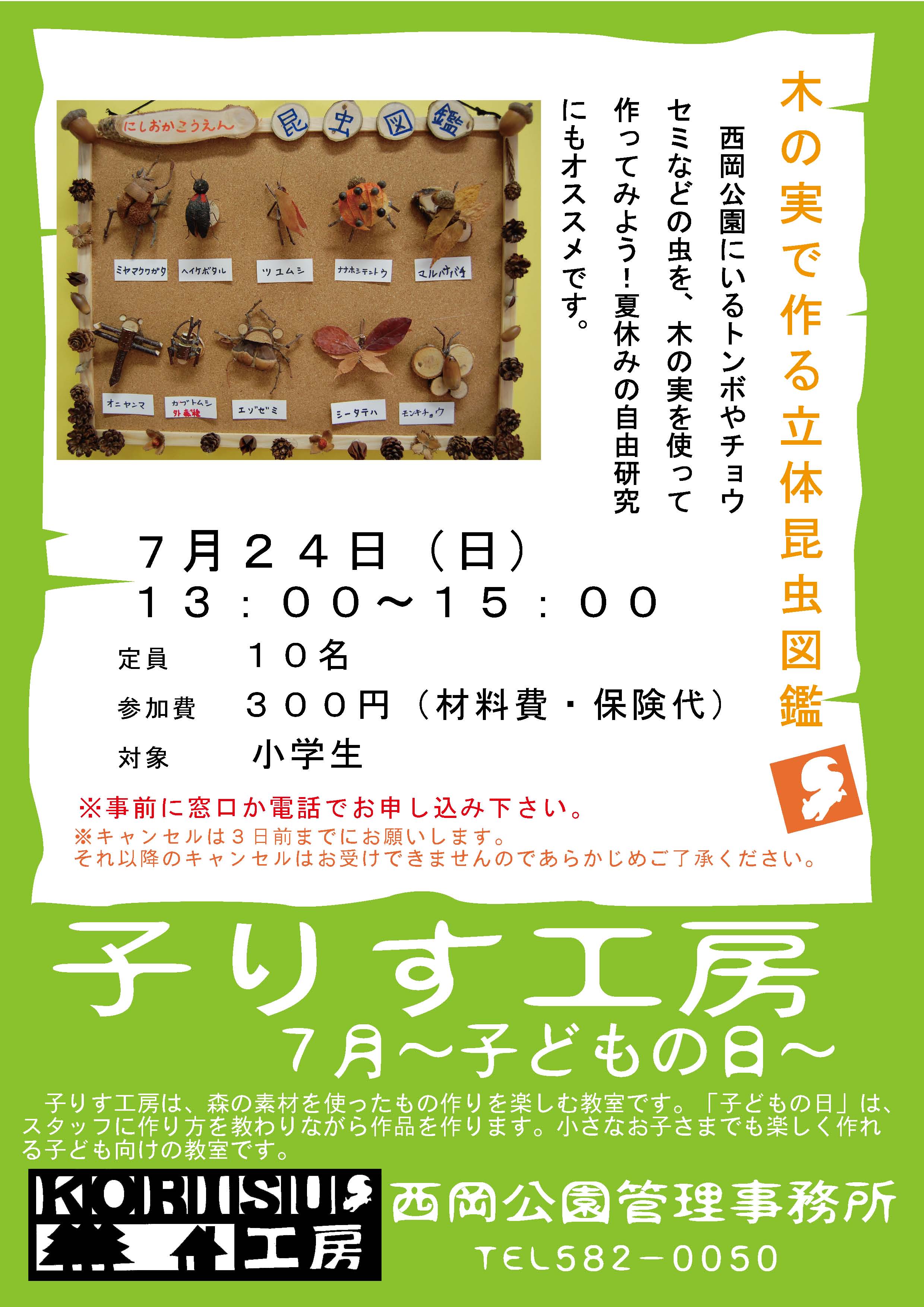 子りす工房~こどもの日7月は、木の実で立体昆虫図鑑を 作ります。 昆虫の足は何本?どこから出てる?・・・・なんてことにも着目 して、なるべく本物に近い虫を作ってみましょう。 夏休みの自由研究にもオススメです。