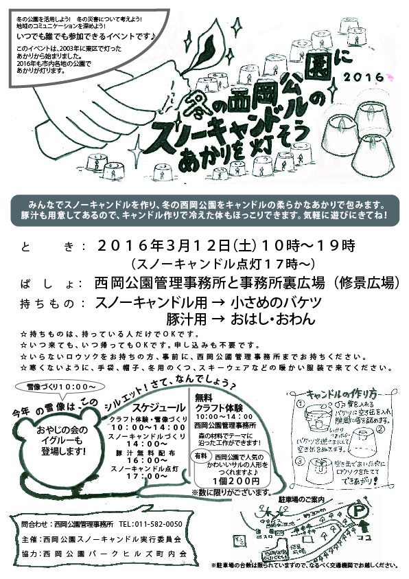 西岡公園で12回目の実施となるスノーキャンドルは、そのタイミングに合わせて明日3月12日(土)に開催します。