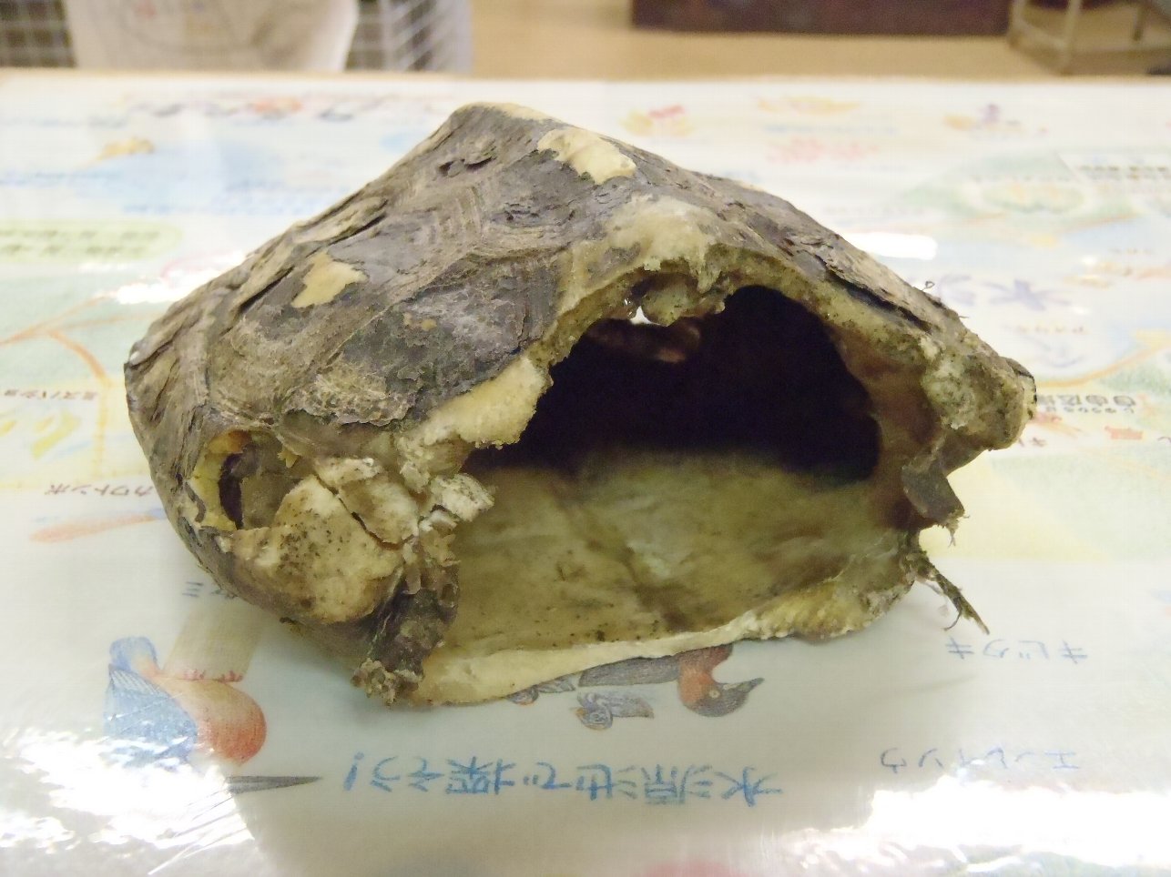 今日は亀のこうらが事務所にやってきました。持ってきてくれた子の話を聞いてみると、どうやら空から落ちてきたようです。よくよくみてみるとぽっかりと穴があいているではありませんか!!こうらは頭の部分が削られていていました。いったいどうして空から降ってきたのか気になります。