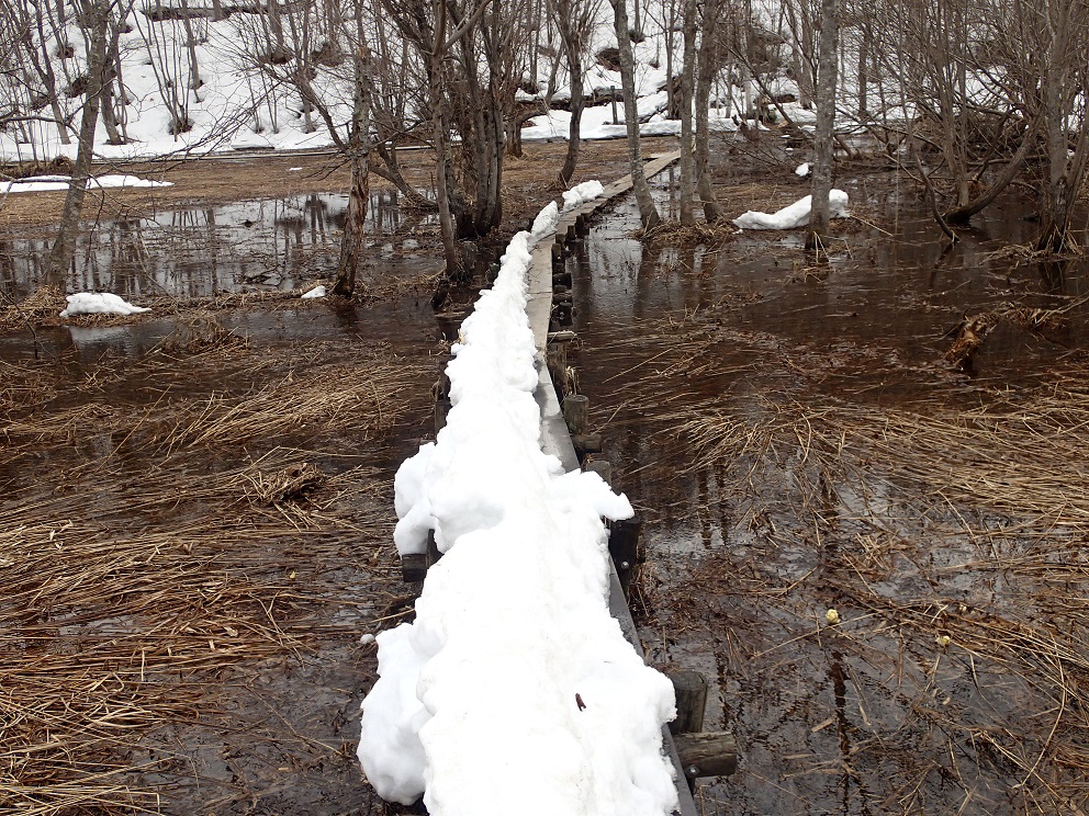 下流側の木道は周回出来ますが、上流はまだ雪が多く危険です。