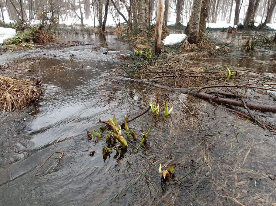ミズバショウは10~15㎝ほど水面から出ていましたが、開花はまだです。