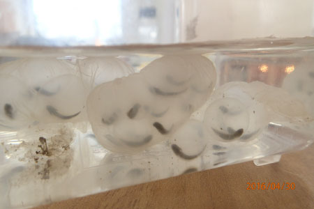 (ちょうど一週間前、西岡さかな組の子供たちが調査の為卵塊を展示してくれました)