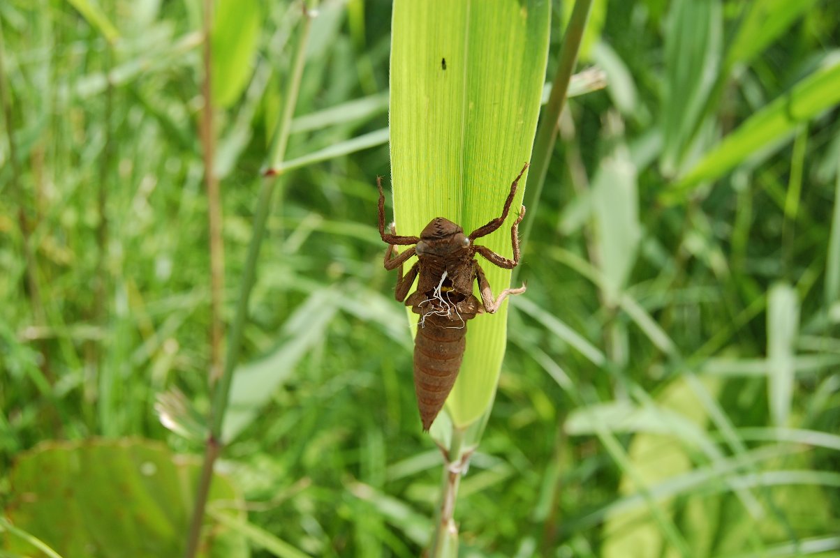 木道を歩いていたら、足下の葉っぱに、4~5cmもあろうかという 大きなトンボのぬけがらが付いていました。 オニヤンマかなと思いますが、本当に大きくて立派でした。