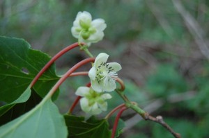 秋においしいキウイのような実をつける、サルナシ(コクワ)の花が咲いています。 ツル性の樹木で、高いところで咲いていることが多いので、地面に落ちた 花で開花を知ることがよくある木です。 この木は、雄株と両生花があり、雄株であれば実をつけません。 写真は両生花で、めしべの部分が少しふくらんで、秋になるおいしい実を彷彿 とさせました。 今年も豊作だといいですね♪