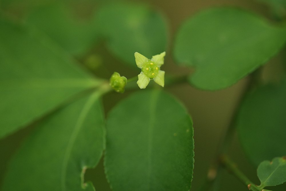 低木のコマユミ、地味な花、秋に赤い実がなります。
