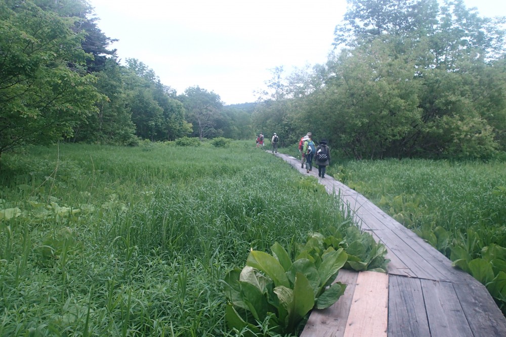 キャンプ場近くから木道に戻り、展望台を目指します。途中クマイザサの花が