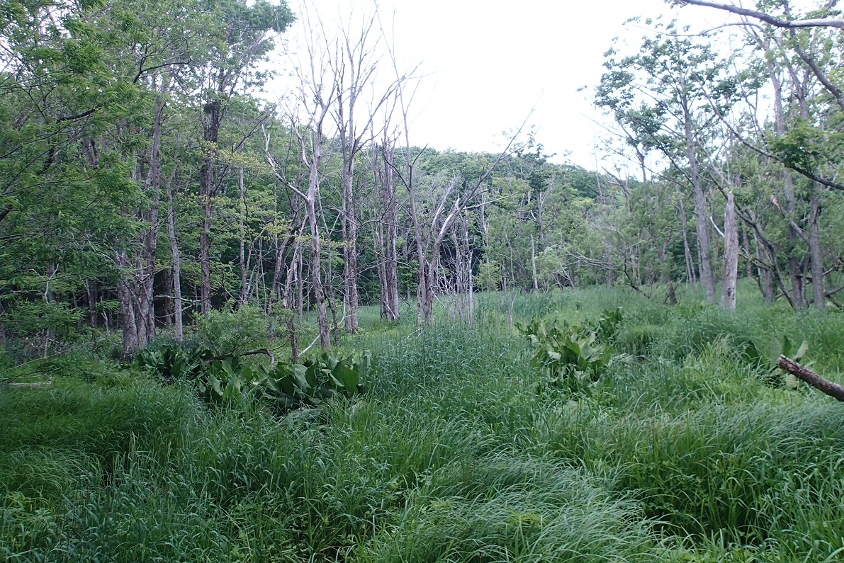 ミズバショウの葉は1mを超えているのですが、ヨシなどの湿生植物に圧倒されてますね。