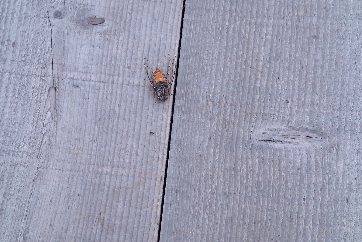 そうした木道を歩いていると、エゾハルゼミが息絶え絶えに落ちてきました。