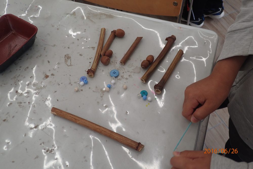 イタドリの茎を乾燥させたモノと木の実やビーズなどを使って