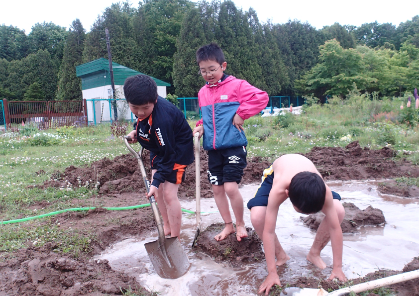 気付いたら男の子3人が穴を掘り出して、その後水を投入・・・・だんだん気分が盛り上がってきたようで、