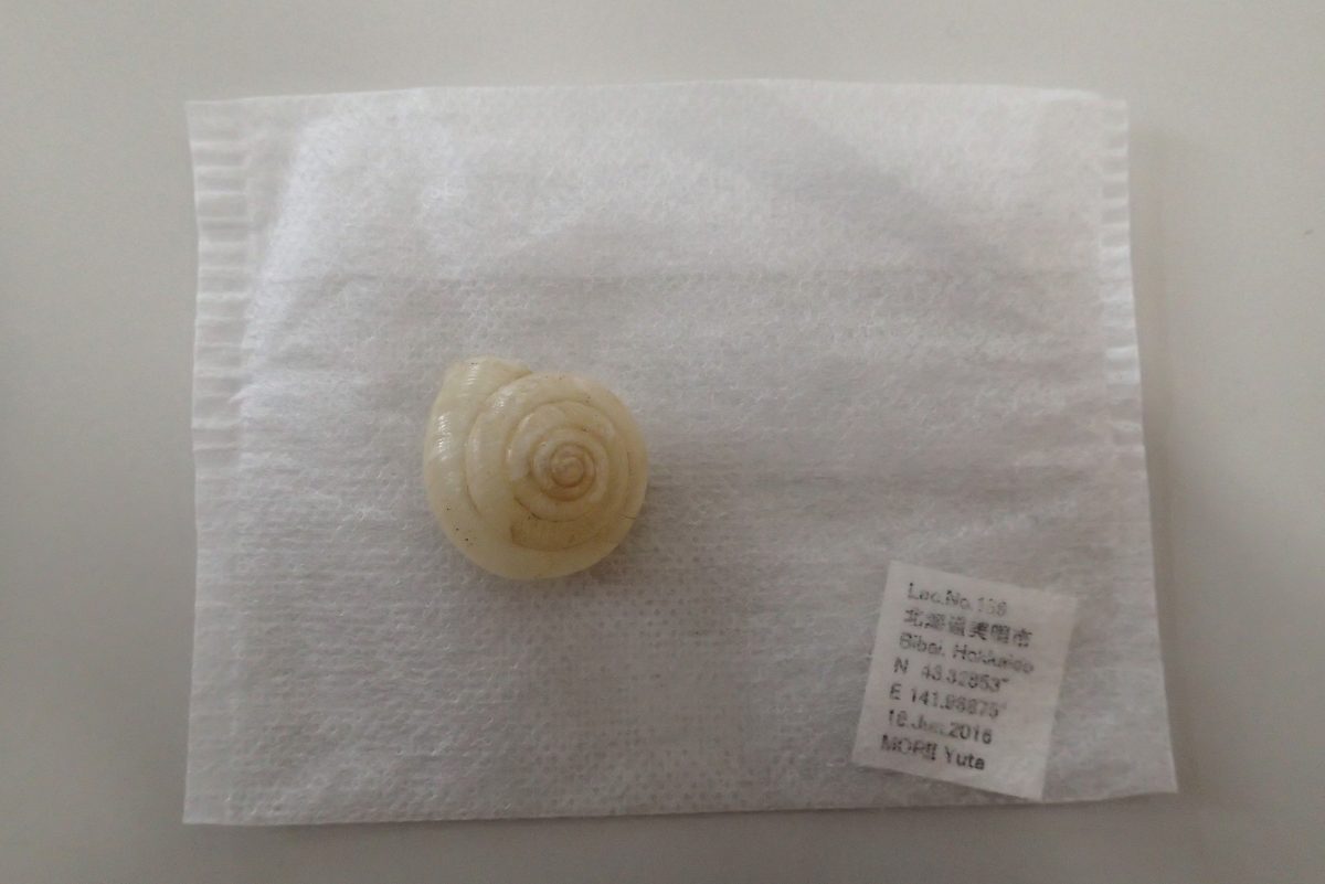 最後は管理事務所に戻って、森井さんからもらったヒメマイマイの殻を磨いて標本を作りました。