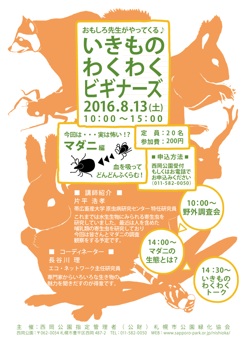 次回のいきものわくわくビギナーズは8月13日に「マダニ編」を行います。