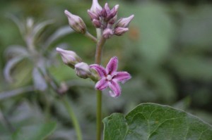 駐車場などで見かけるこの花、夏なのにモコモコしていてちょっと 暑そうです。 ガガイモというツル性の植物で、よ~く見るととってもかわいいお花です。 実も特徴的なので、チェックしてみてくださいね。