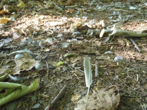 管理事務所横のドイツトウヒの並木で鳥の羽が落ちていました。