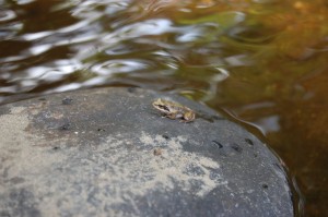 夏休みに入り、西岡公園はたくさんの子ども達で賑わっています。 八つ橋に行ったら、川岸の石に、エゾアカガエルがたたずんでいました。 さっきまで、子ども達に遊ばれて、ピョンピョン逃げてきたようです。 夏休みはカエルたちも、忙しそうですね。