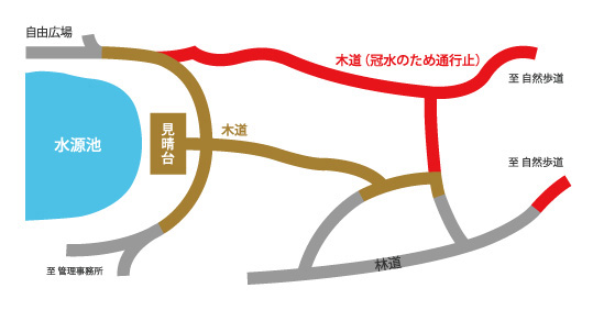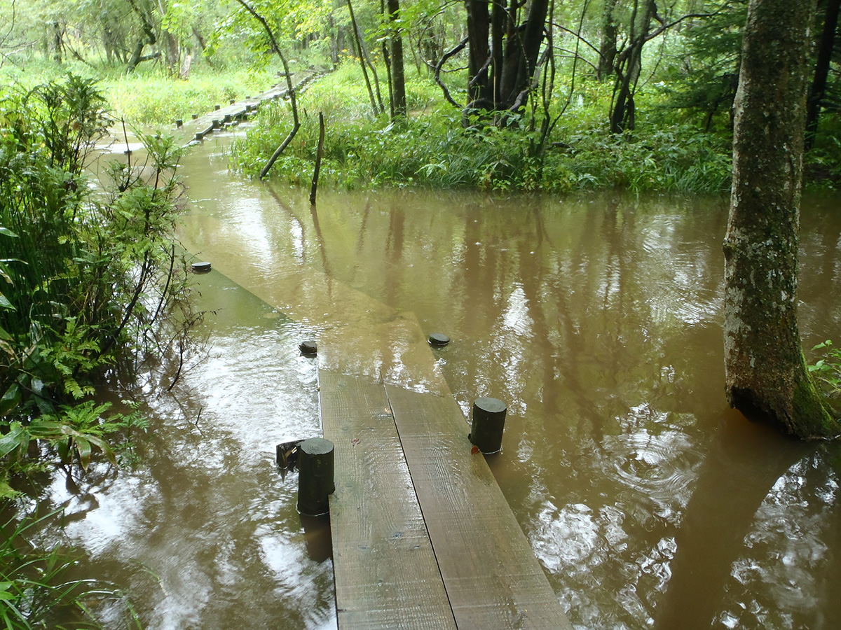 ここ数日の大雨により、公園内の木道が一部冠水しています。
