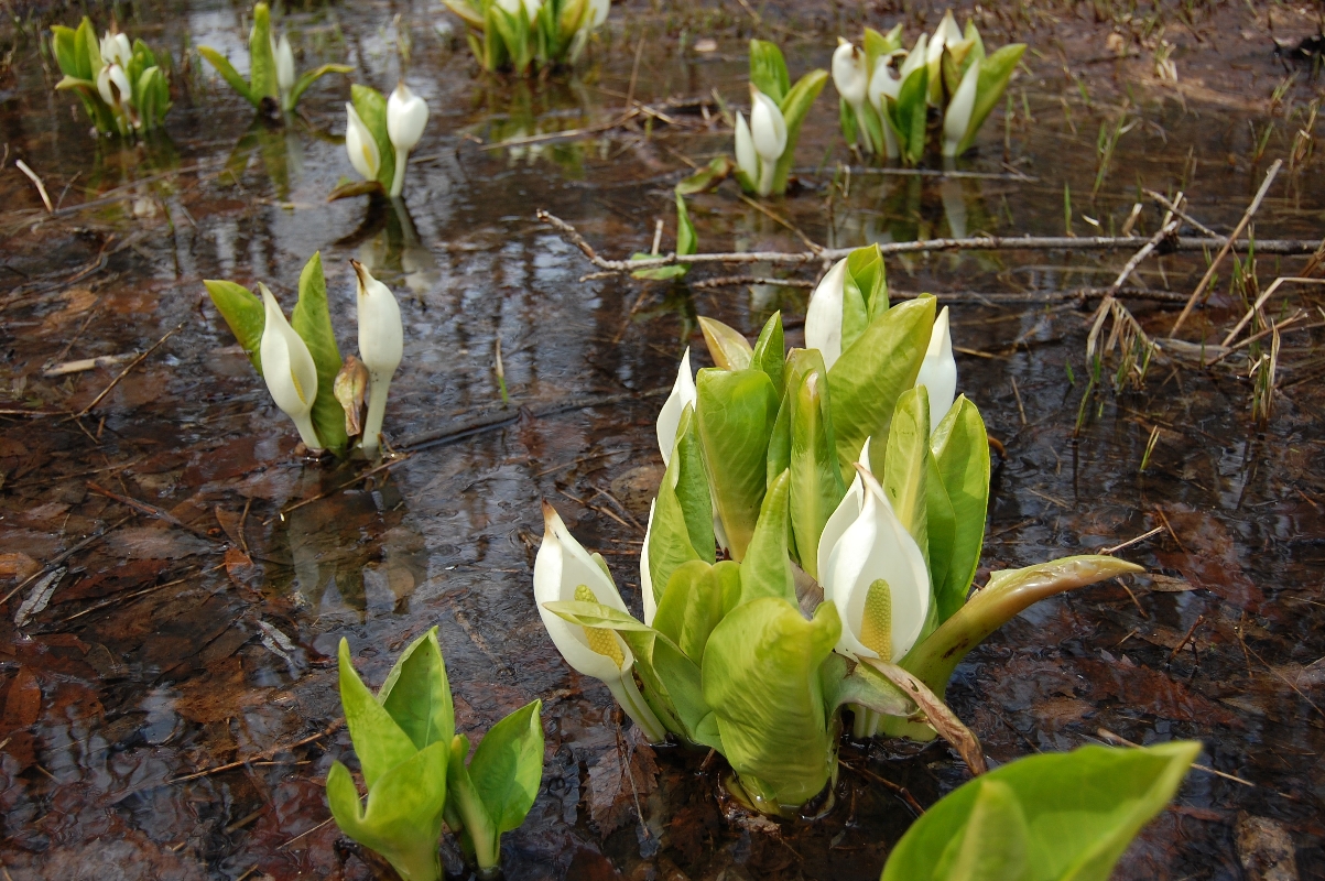 今日、水源池の氷がすべて溶けました!いよいよ春本番です。湿原では、ミズバショウも咲き始めていますよ。来週から再来週が見頃になりそうです。