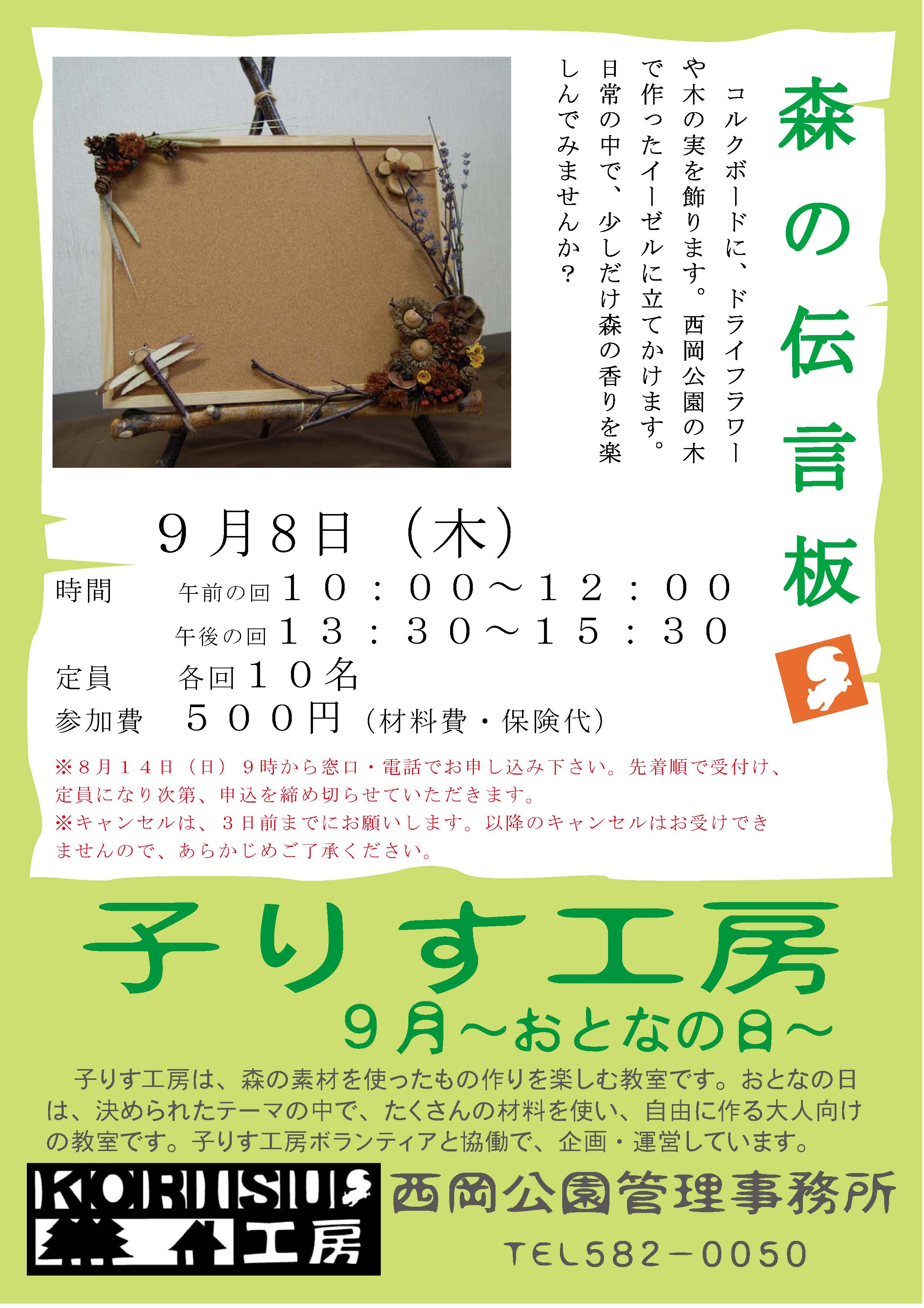 9月のおとなの日は、コルクボードをドライフラワーや木の実で 飾り付けて、森の伝言板を作ります。 公園の木を使ったイーゼルも作れて、満足度満点の講座です。 是非ご参加ください。