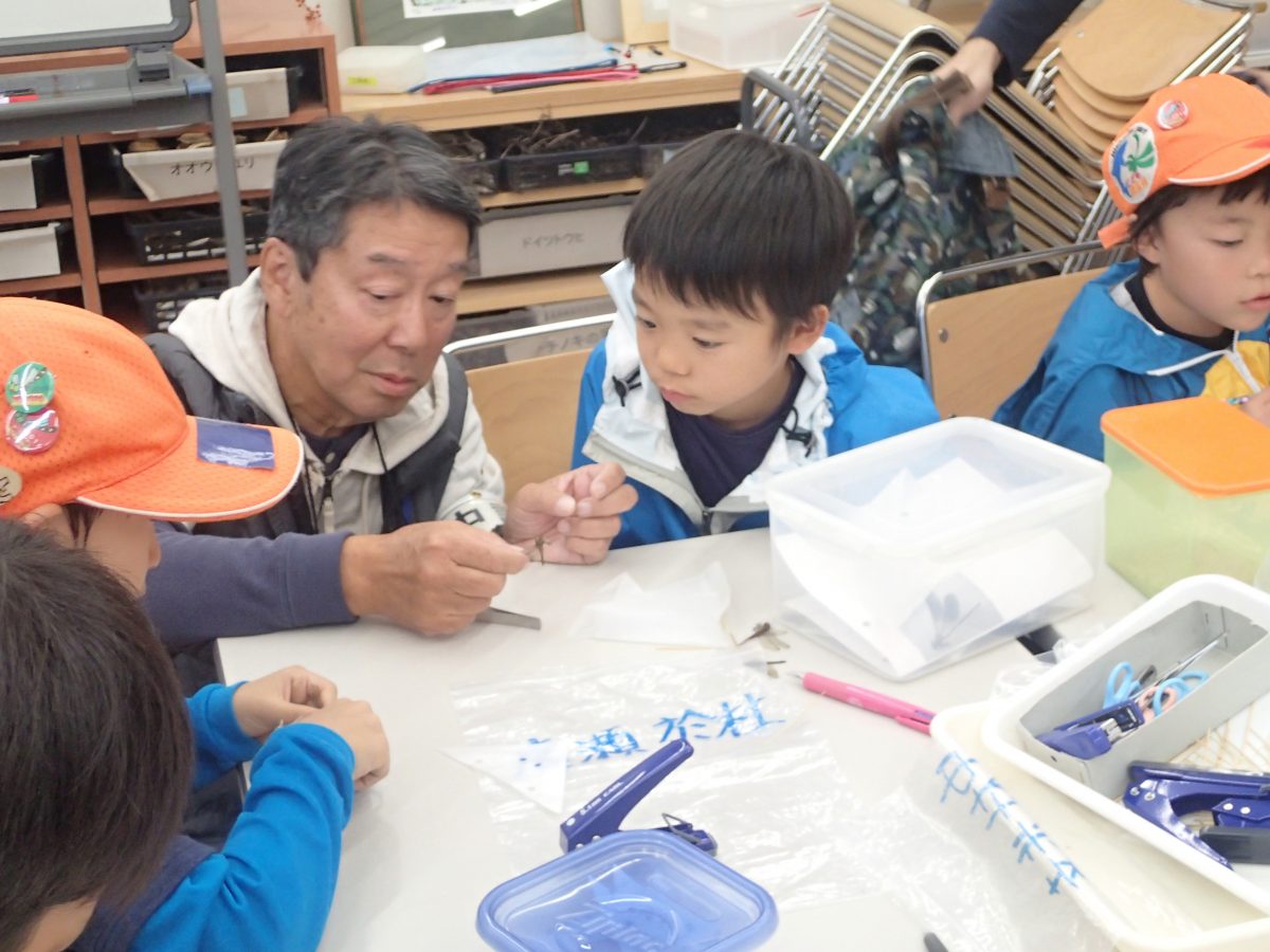 午後は3班に分かれて活動しました。第1班は,午前中にトンボを採集した団員の班で,標本づくりです。横山さん指導のもと,展翅標本にチャレンジした子もいました。標本作製チームは少人数だったこともあり,とってもきれいな標本ができたようです。年度末の活動報告展が楽しみですね。第2班は来週開催される「にしおかピクニック」で使う景品作りです。今年は折り紙でトンボをつくりました。低学年団員は高学年のお姉さん団員に教えてもらいながら,みんなで心のこもった景品を作っていました。