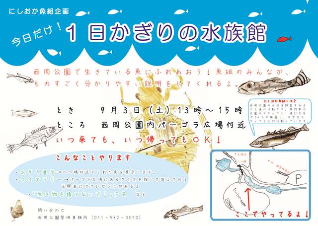 来月の9月3日(土)の13時~15時に「1日かぎりの水族館」と題して、西岡公園に流れている月寒川に住んでいる魚の紹介を行います。川に住んでいる魚の水槽展示や、クイズに正解するともらえる「魚組特製しおり」、また、生き物を捨てないでなどのPRも行います。