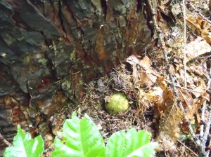 今日、少し離れたところに、エゾリスの姿を見つけました。 じ~っと見ていると、木の上から地面に降りて、木の根元を掘っています。 エゾリスが去った後に見てみると・・・・・・木の根元に少しだけ埋められた クルミの実を見つけました。 エゾリスは、もう冬の食料を蓄えているんですね。