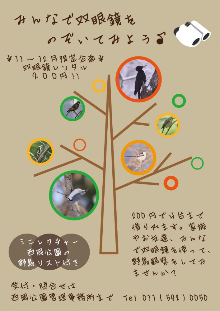 西岡公園では普段から双眼鏡の貸出しを行っていますが、この期間に限りミニレクチャーと西岡公園野鳥リストが付いてきます。