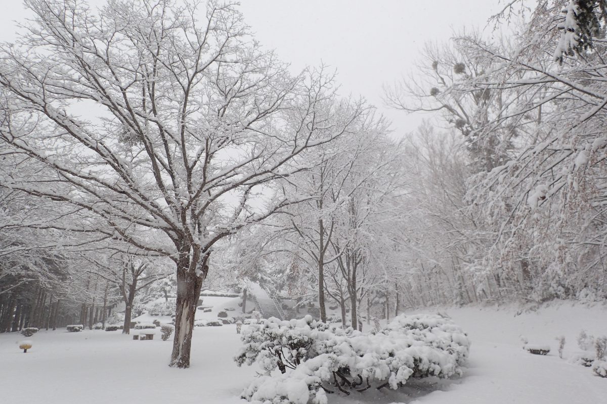 西岡公園は15~20cmくらいの積雪となりましたが、湿った雪&風によって落雪や枝折れの可能性があります。