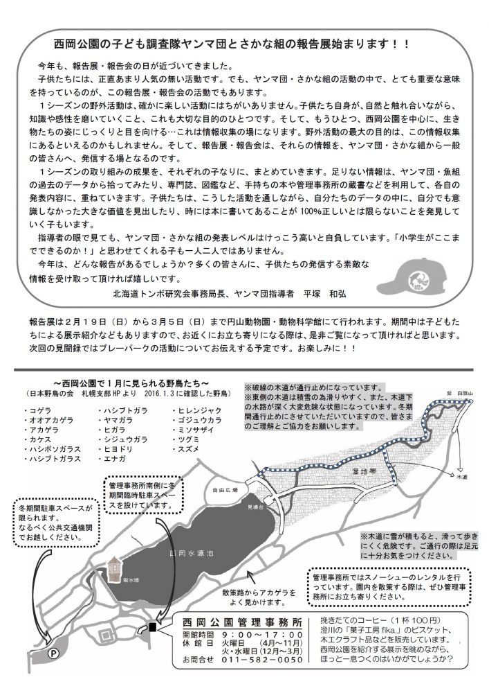 裏面では西岡公園の子ども調査隊ヤンマ団とさかな組の報告展が2~3月に円山動物園・動物科学館にて行われる事をお伝えしています。