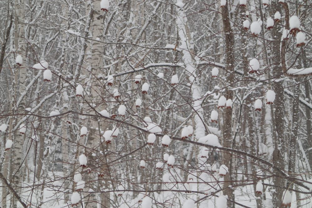 写真はツリバナに積もった雪。可愛らしく、まんまるになっていましたよ!