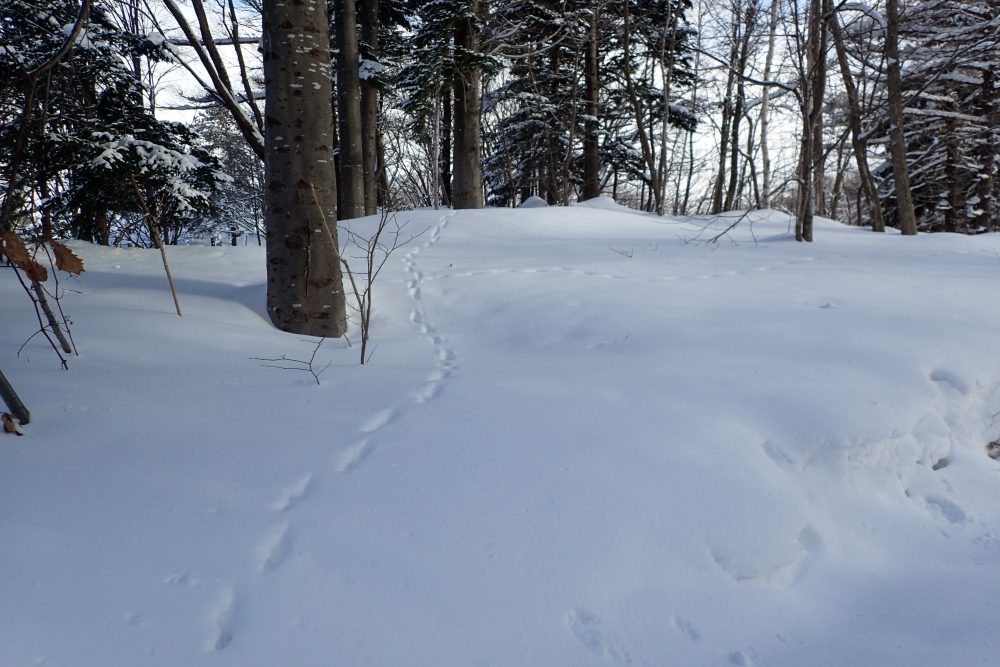 園内ではあちこちで動物の足跡を見ることができます。どんな動物の足跡なのか想像するのも楽しいですが、その動物がどんな風に歩き回ったのか?足跡が交差する動物たちはどちらが先にどこへ歩いて行ったのでしょう?痕跡から推理する楽しみ方は、冬ならではですよ!