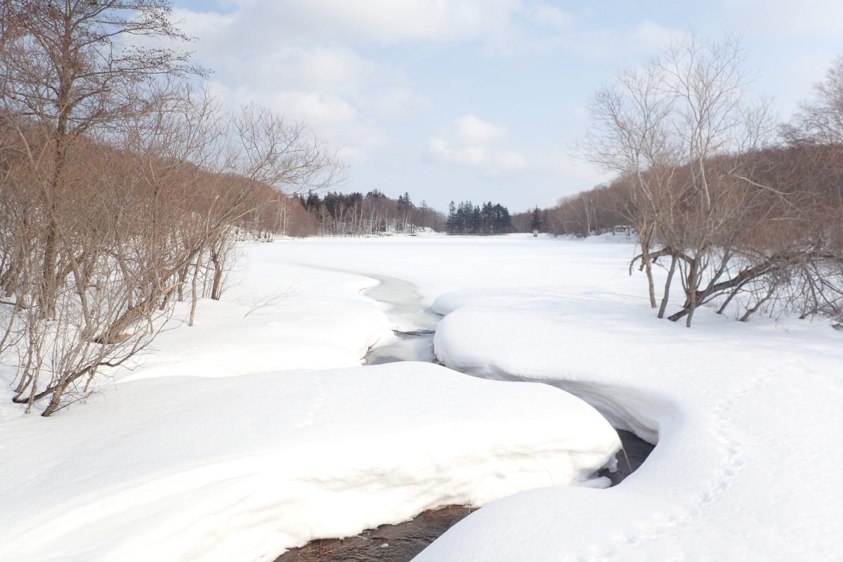 気温が高くて、水源池に流入する水の道が見えてきました。